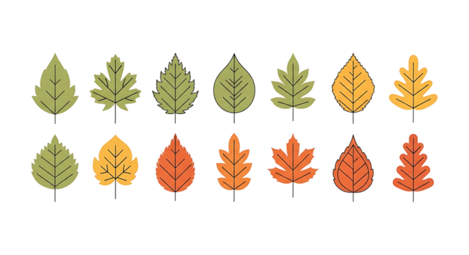 Assorted Autumn Leaves Illustration in Green Yellow and Orange Hues.