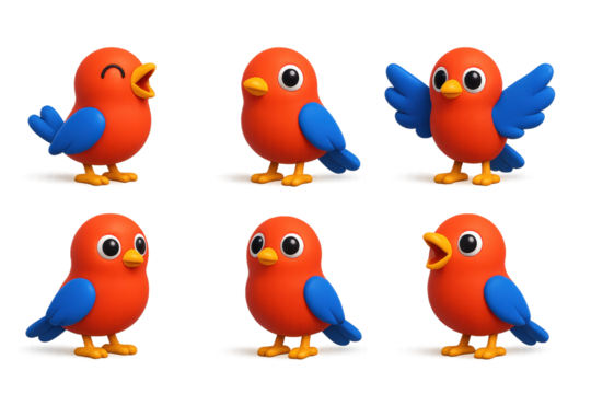 Vivid Bird Icons. 3D icon set of bird expressions: singing pose, listening tilt, wings spread, perched calmly, looking up, calling