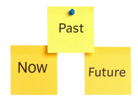 Three yellow sticky notes with the words "Past," "Now," and "Future" pinned and arranged in a triangular formation.