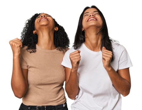 Young Latin friends in studio celebrating a victory, passion and enthusiasm, happy expression.