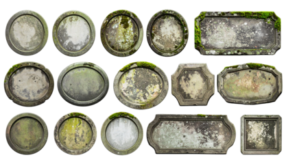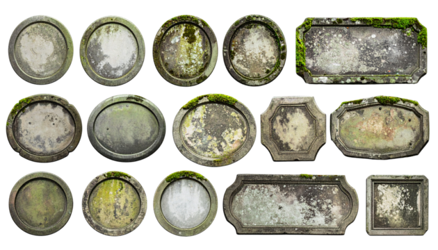 Set of Assorted Aged Stone, Concrete, and Marble Plaques with Moss Isolated