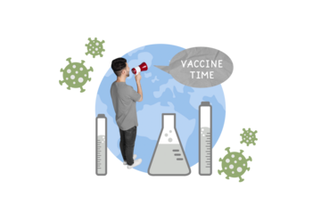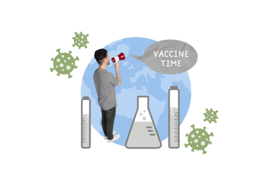 Collage photo of young guy activist vaccine time hold loudspeaker announcement global pandemic infection isolated on blue color background