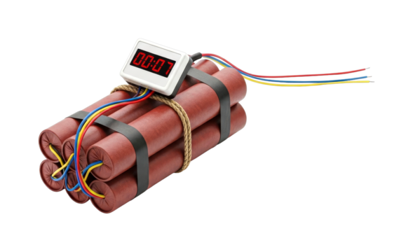 A classic red alarm clock timer attached to dynamite sticks representing a ticking time bomb isolated on transparent background