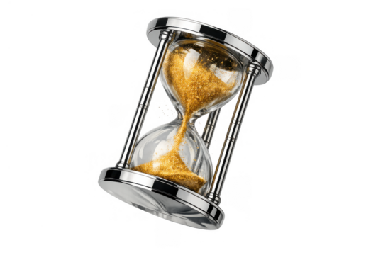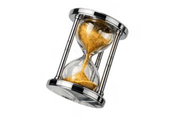 Hourglass with golden sand flowing, symbolizing time passing, countdown, urgency, and deadlines on transparent background