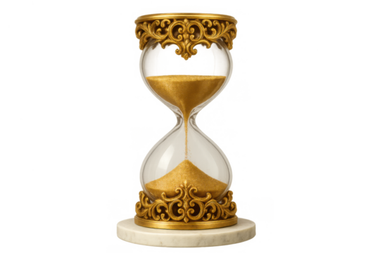Ornate golden hourglass with sand flowing, symbolizing time passing, countdown, deadline, and urgency on transparent background