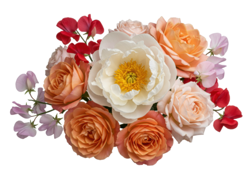 transparent peony, peach and pink roses, colorful sweet peas on transparent, soft studio light. Concept of timeless floral elegance