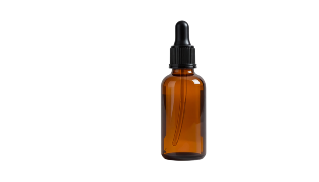 Dark glass dropper bottle with black cap for essential oils serums cosmetics and pharmaceuticals isolated product photography isolated on transparent background