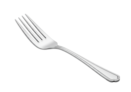 Pristine four-tined polished silver dinner fork, gleaming with intricate handle detailing, dynamically angled on a sterile white background, concept of minimalist elegance.