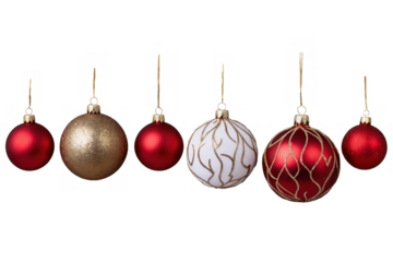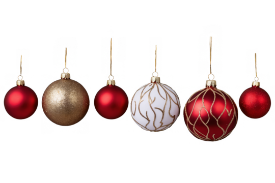 Five Christmas baubles with various designs hanging against a transparent, white background, png