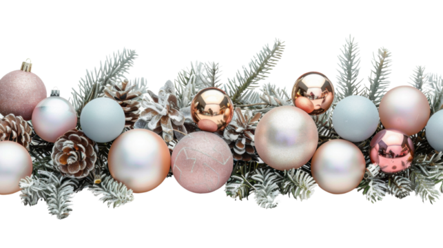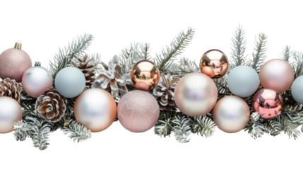 Christmas gold tinsel and gold balls toys decoration for holiday isolated on transparent background. Border