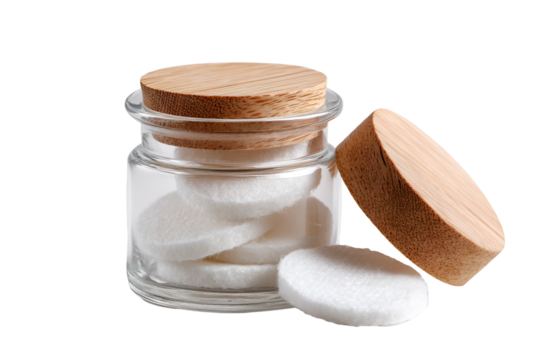 Small glass jar with cork lid containing white powder and a pill isolated on transparent background