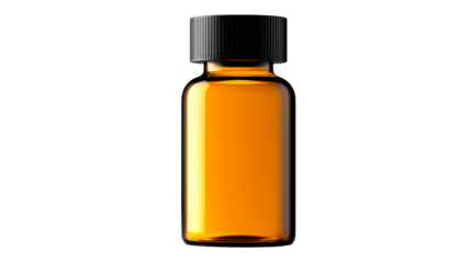 Amber Glass Dropper Bottle with Black Cap Filled with Amber Liquid, cut out transparent