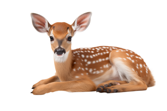 A fawn with white spots is lying down against a  looking ahead transparent background png