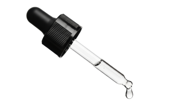 Isolated eyedropper is clear with a black bulb and a drop on the tip ready for use