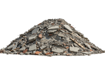 Pile of broken concrete rubble and rebar on sandy ground with tire tracks debris construction demolition waste materials