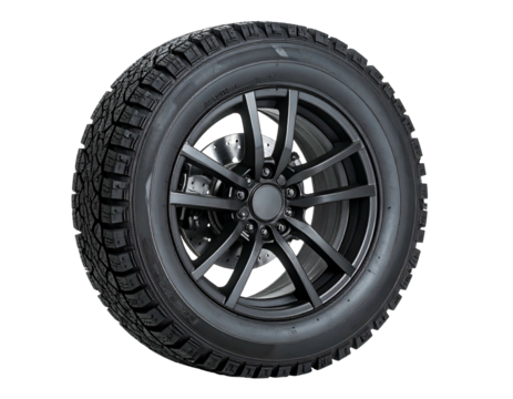 Closeup of a black car tire with a fivespoke rim isolated on transparent background, showcasing its tread pattern and automotive design