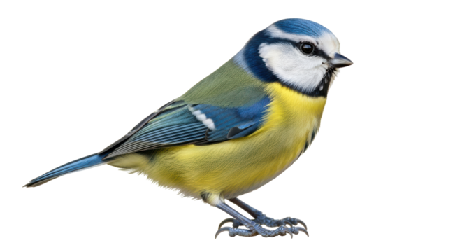 Isolated Eurasian blue tit perched, standing on its feet, blue yellow plumage, songbird