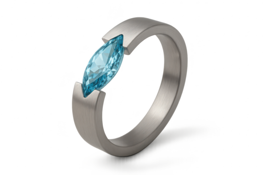 Modern brushed metal ring with blue marquise gemstone, isolated on transparent background.
