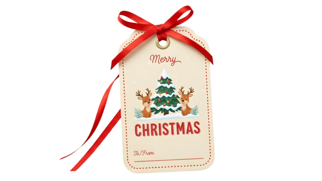 Merry christmas gift tag with red ribbon, festive tree, reindeer, and snow design