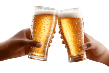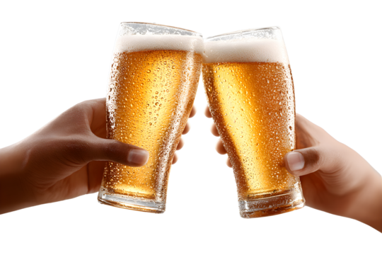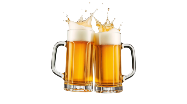 Two frosty beer mugs clinking together with a splash of beer, isolated on transparent background