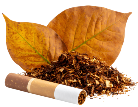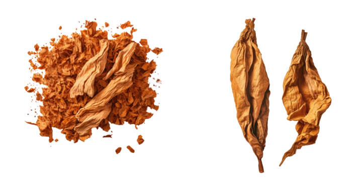 High-quality tobacco leaf and cut tobacco isolated on transparent background, PNG format.