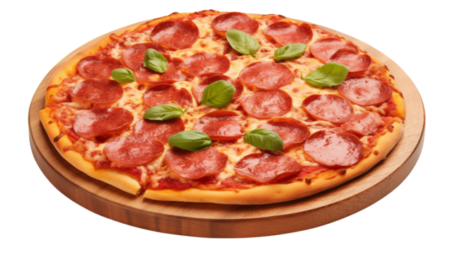 A pepperoni pizza with basil leaves on a wooden board ready to be served for a delicious meal today
