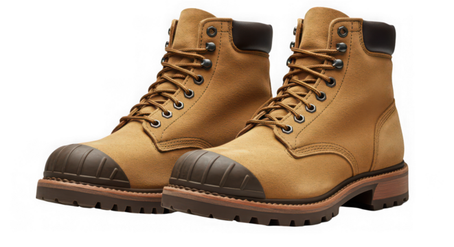 Pair of brown leather work boots with black toe caps isolated on transparent background