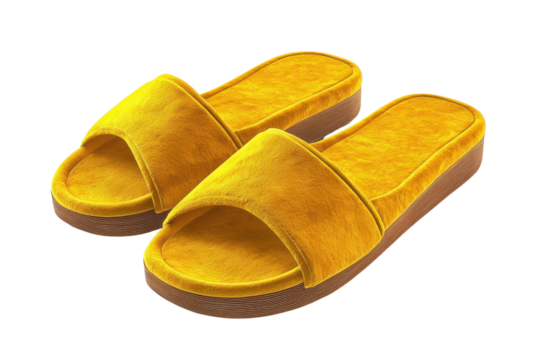Vibrant yellow slippers with an open-toe design and comfortable sole, perfect for casual wear and relaxation around the house.