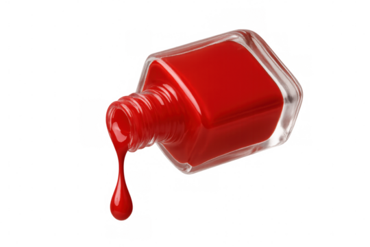 Red nail polish dripping from an open bottle, isolated on a transparent background, ready for beauty and fashion projects