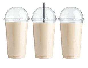 Three tall drinks in clear plastic cups with domed lids and a black straw