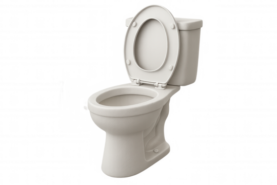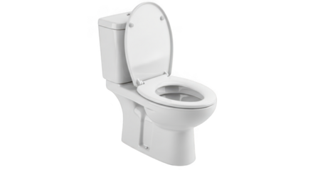 White ceramic toilet bowl with open lid, isolated on transparent background, representing bathroom fixtures and sanitation
