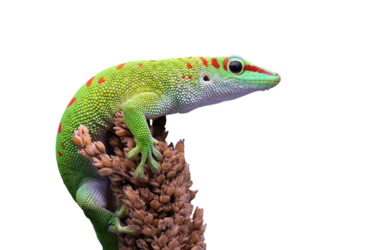 Tokay Gecko lizard sitting on tree branch isolated on transparent background