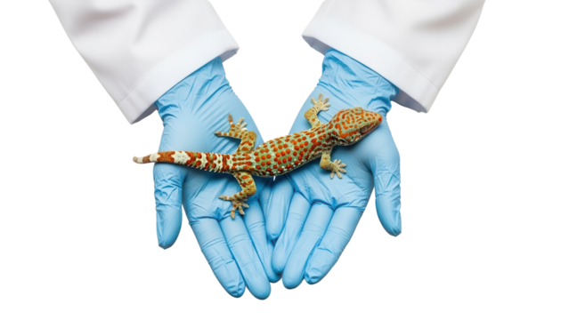 spotted Tokay gecko resting on the palms of a veterinarian wearing blue medical gloves, isolated on a white background