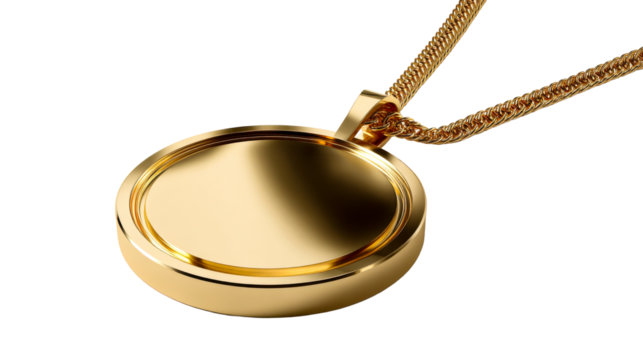 Shining opulent gold pendant with a sturdy linked chain embodies luxury and elegance, perfect for highend jewelry marketing campaigns and representing valuable personal accessories.
