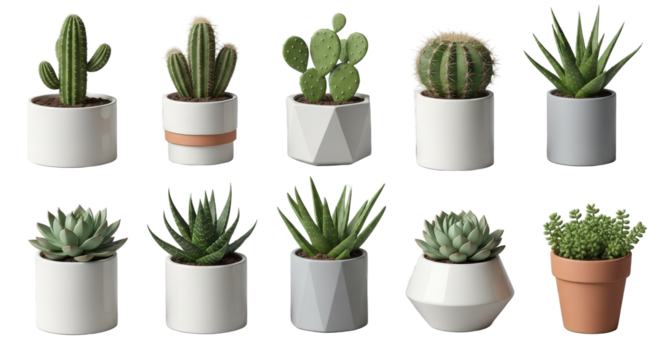 Collection Of Various Potted Cacti And Succulents With Green Leaves In Simple White Gray And Terracotta Pots isolated on Transparent Background