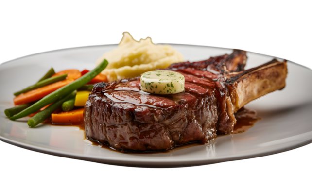 Juicy grilled bone in steak topped with herb butter served with mashed potatoes and colorful vegetables on transparent background