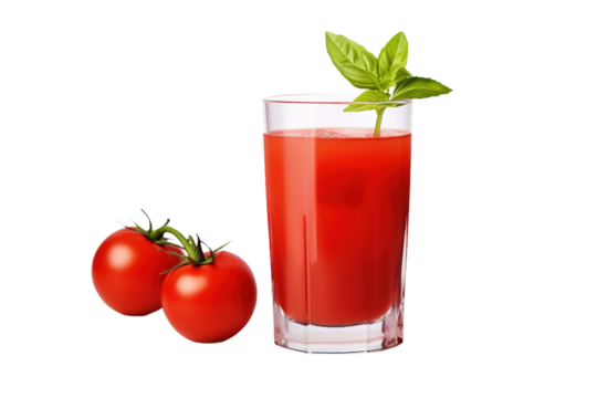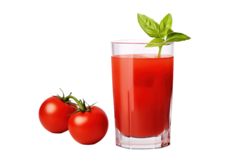 Fresh tomato juice in glass with sliced tomatoes, healthy drink, red vegetable, vitamin rich, natural food, isolated on transparent background