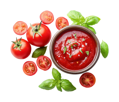 Delicious tomato sauce preparation kitchen food bright environment top view culinary. Isolated on transparent background, png.