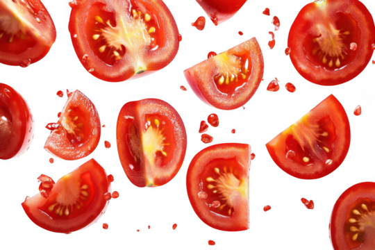 Fresh, juicy tomato wedges scattered, vibrant red color, healthy diet, cut out transparent