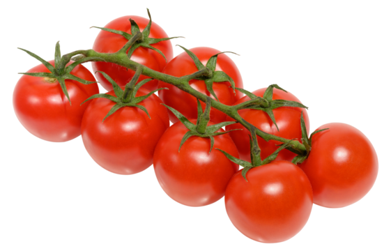 A bunch of fresh juicy red ripe tomatoes on the vine isolated against a transparent background