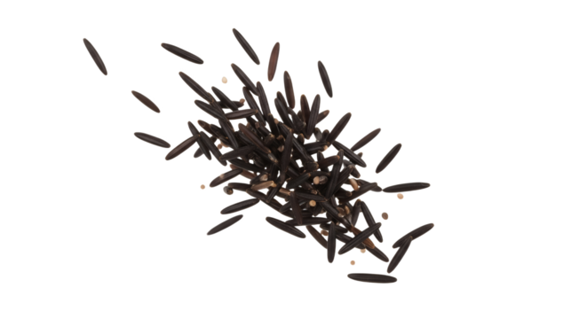 Artistic display showcasing the individual grains of wild rice against a stark white background revealing subtle textures and tonality capturing the