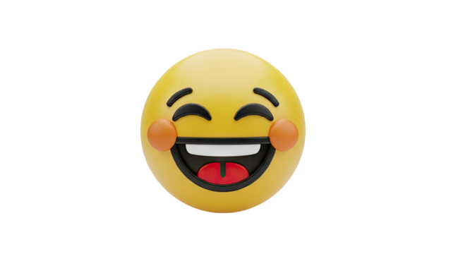 3D Laughing emoji face with red cheeks and tongue out on transparent background