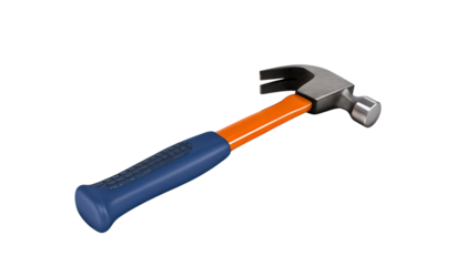 A claw hammer on a transparent background. The hammer is a metallic head with a dark finish and a claw and striking surface