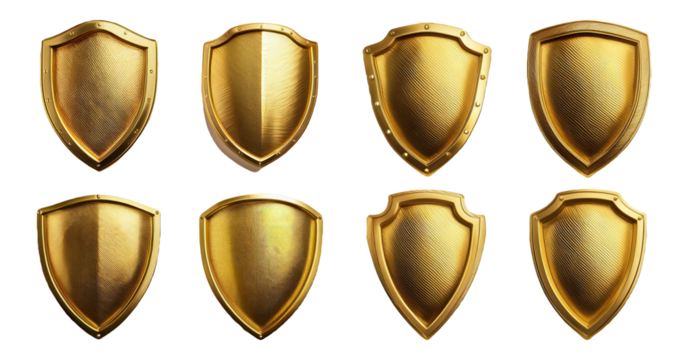 Set of gold shields in different shapes and sizes isolated on transparent background