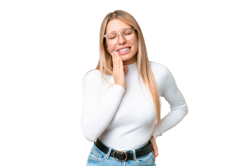 Woman suffering toothache or dental illness on teeth with painful expression, isolated on transparent background
