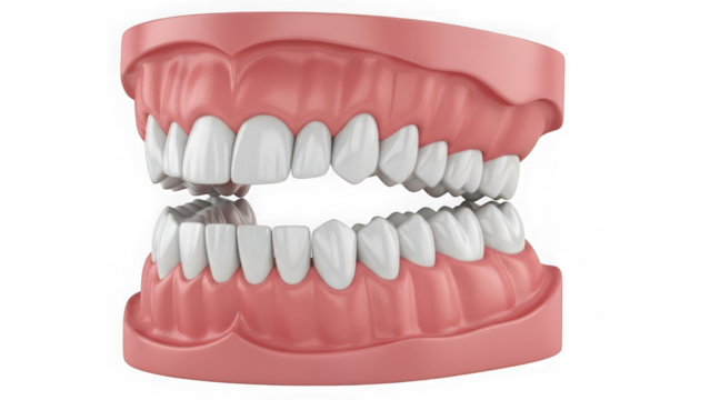 Realistic full set of dentures showcasing healthy, bright white teeth and natural gum appearance for dental marketing