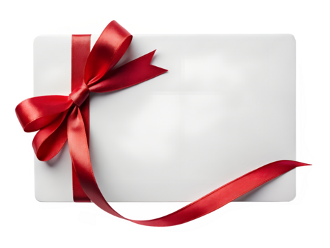 A white rectangular card with a red ribbon tied around the top left corner on a transparent background