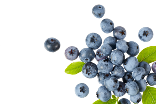 fresh blueberries with leaves corner frame top view isolated on white or transparent png