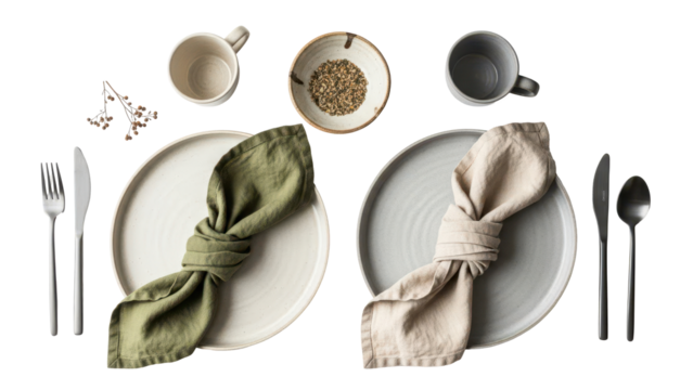 Top down flat lay composition of Scandinavian table setting with stoneware plates and linen napkins isolated on white background