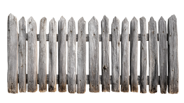 Rustic wooden fence with pointed tops against a clear background ideal for landscaping, isolated on white background